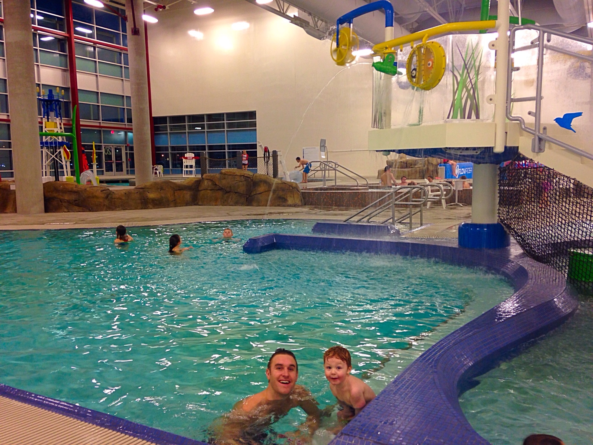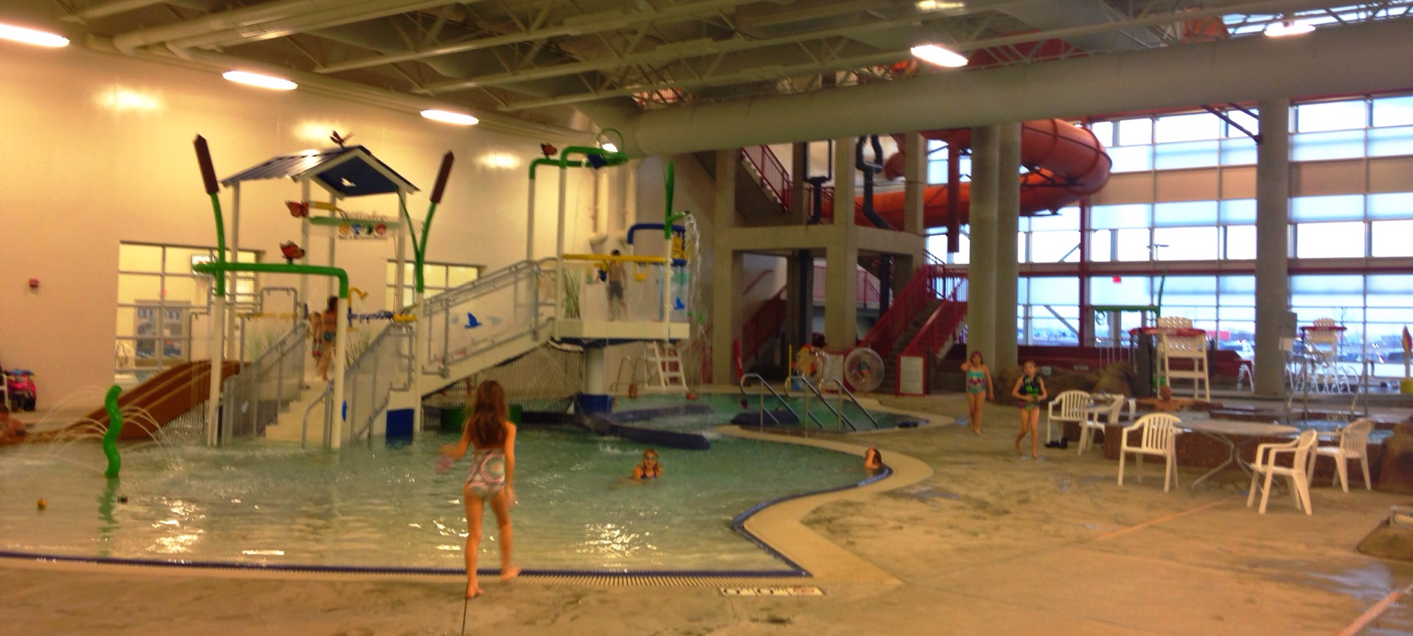 Lazy river, water slides, zero entry pool, hot tub and waver rider. Many hours of fun was had. It felt strange to be playing on the playground and swimming under a roof, but it works!