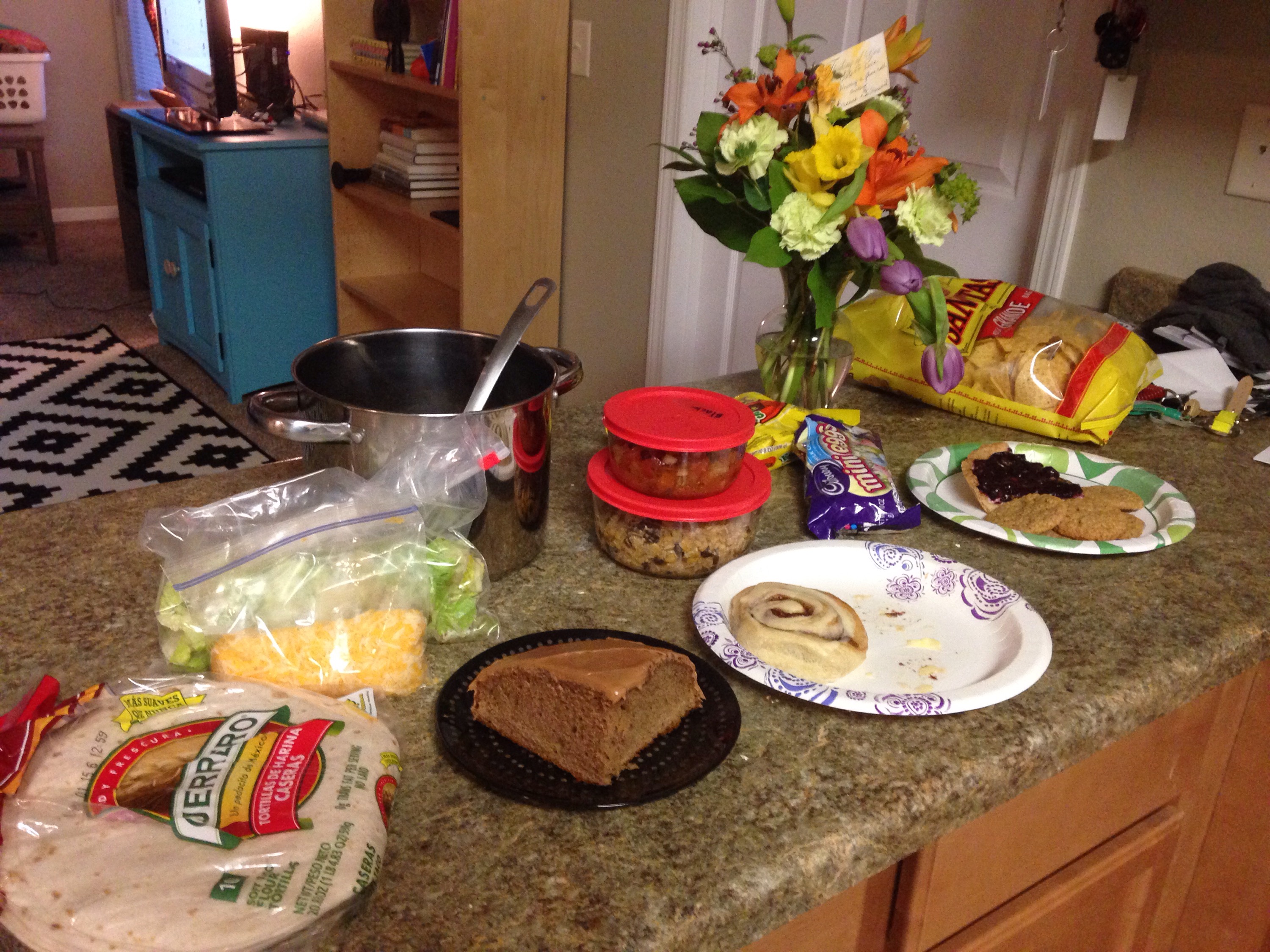 Not only has my family and loved ones far away wrapped their arms around me via technology and through the mail, my friends here in Watford have wrapped their actual arms around me. Plates and dishes full of food have shown up at my door. My kitchen table is covered in flowers, beautiful, bright, sweet smelling flowers. My boy has spent hours at other people’s houses and he has been happy. Calls and texts, offers of help have been blowing up my phone. New friends have let me cry and shared with me their own sorrows from losing children. Danny’s bosses have encouraged him to be with me as much as we needed. People I barely know offering me words of comfort, and others yelling at me that I didn’t ask them for more help.